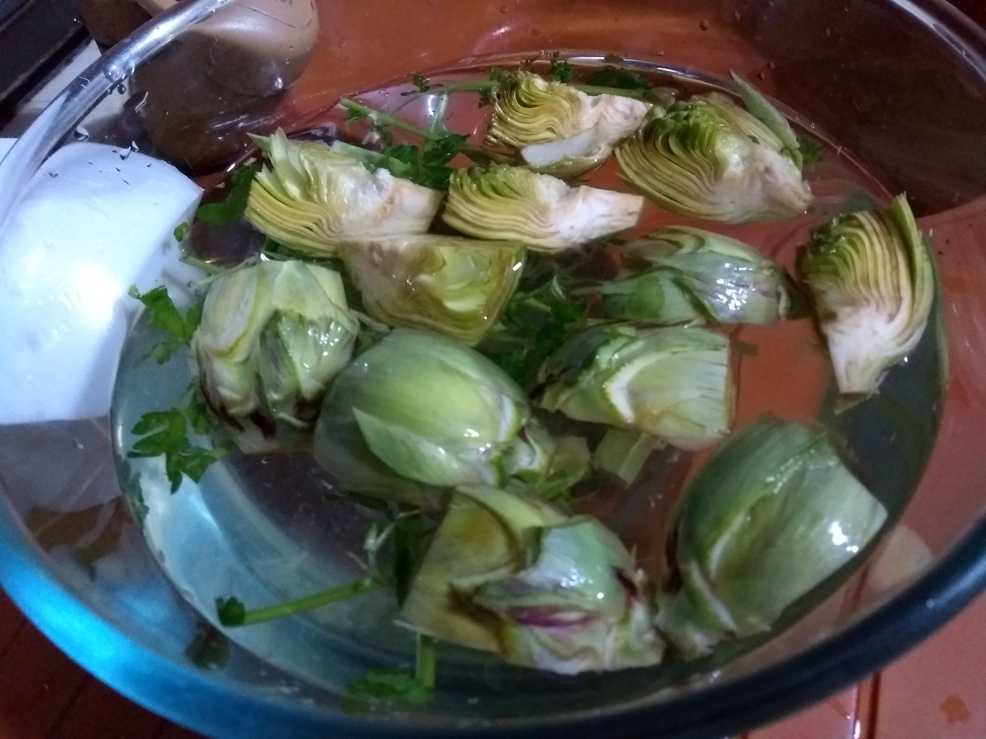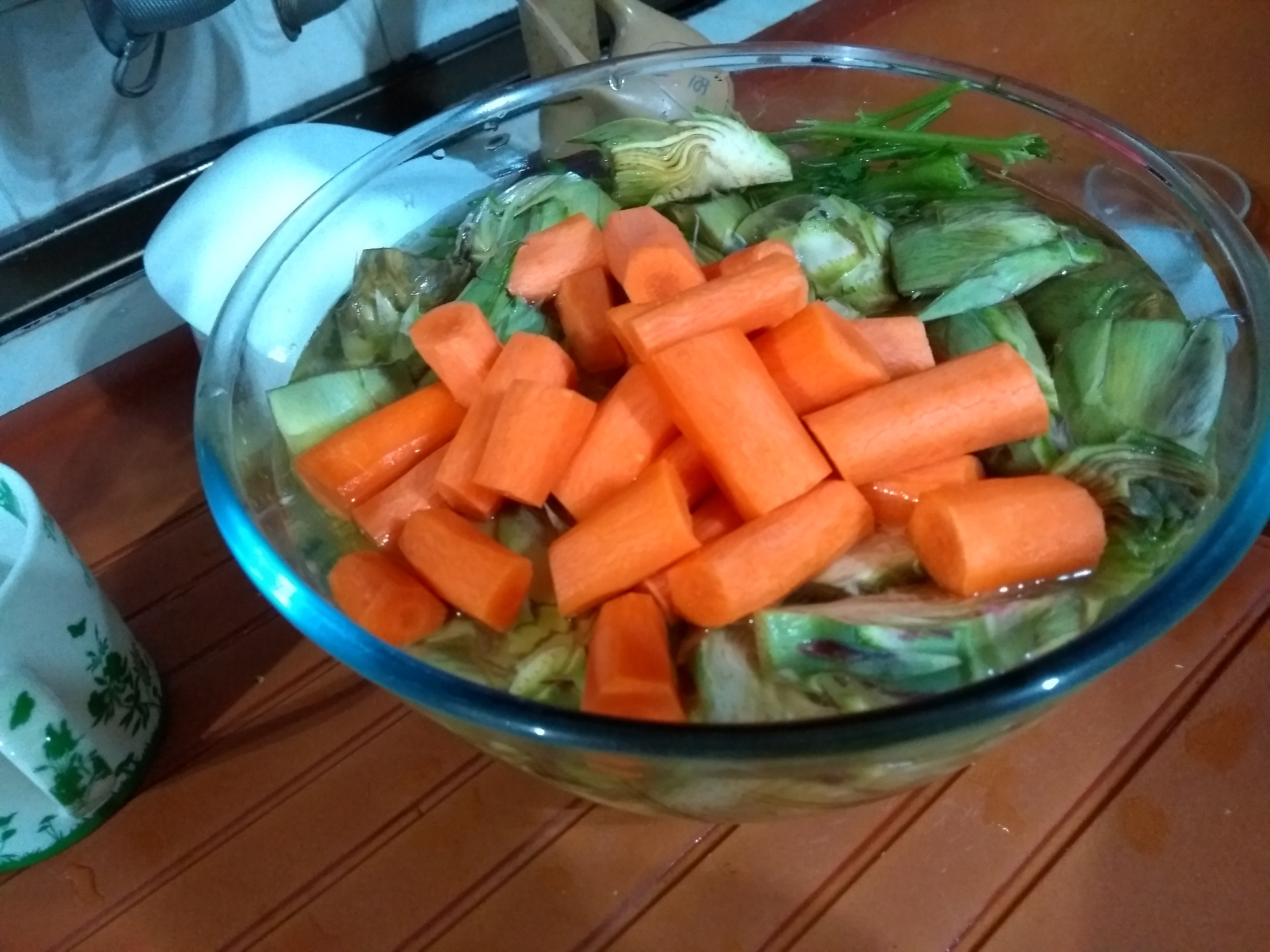 Cortar un limón por la mitad y exprimirlo en el agua. También poner perejil en el agua (esto evita que las alcachofas adquieran un color oscuro). Pelar las alcachofas y ponerlas en el agua con el limón y el perejil. Dejar de lado. Poner un chorrito de aceite en la olla rápida y saltee 1 cebolla con 2 dientes de ajo. Pelar y cortar las zanahorias en rodajas y añadir. Cortar las alcachofas por la mitad y añadir. Freír una cucharadita de harina. Añadir un vaso de vino blanco y 2 de agua (hasta que quede al ras con las alcachofas) agregar sal o una pasta de caldo de verduras. Cerrar la olla y cocinar 3 minutos (esto dependerá de la olla express que tenga), la mía, Kuhn Rickon, en 3 minutos está listo.