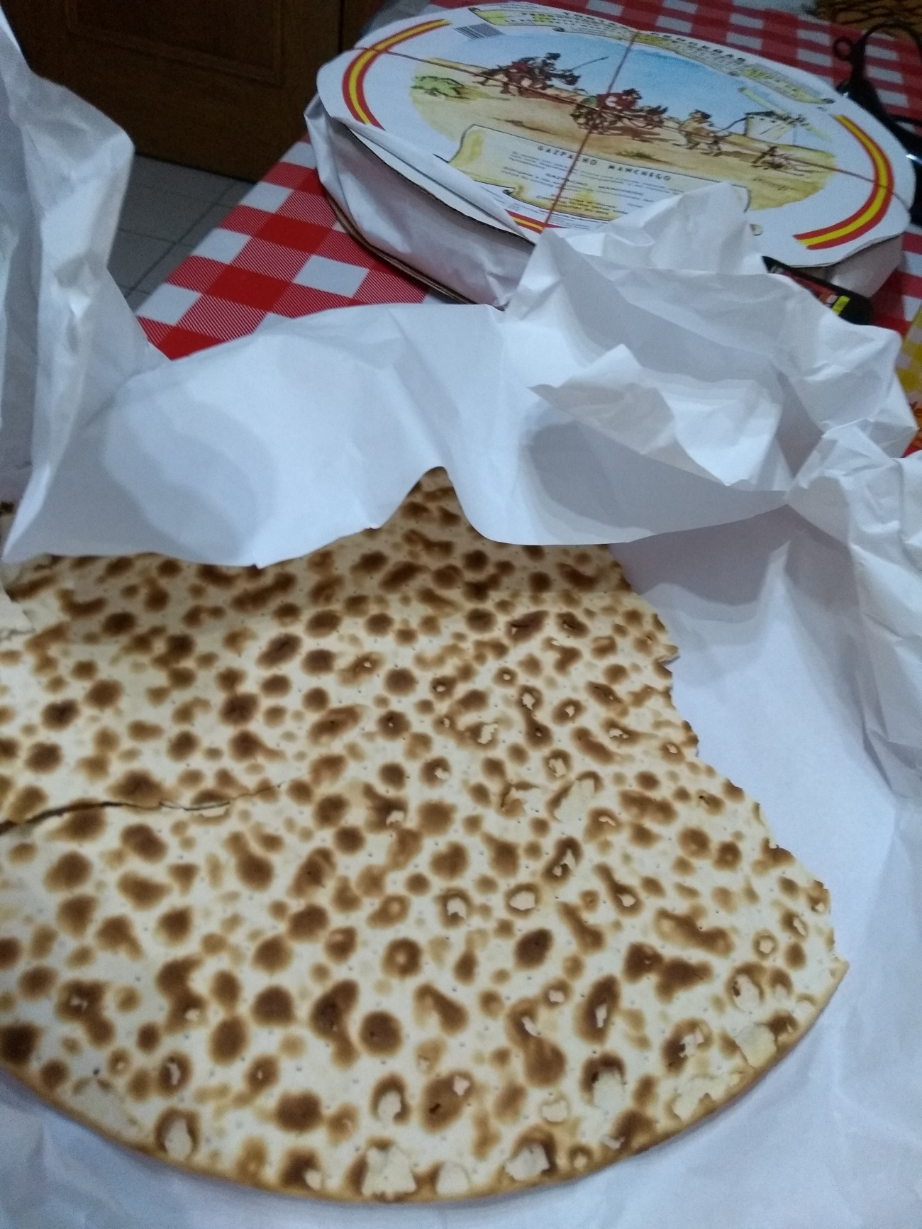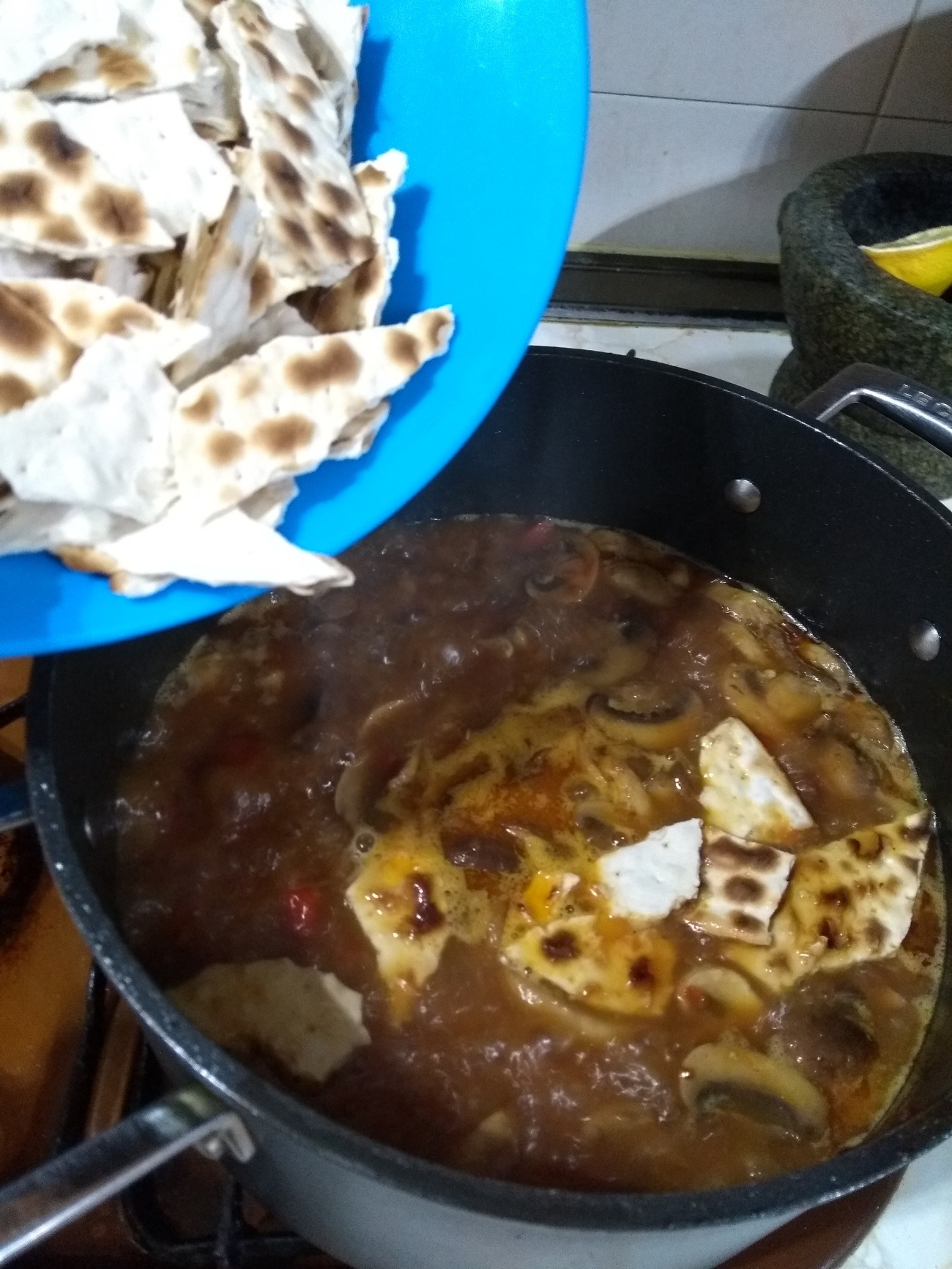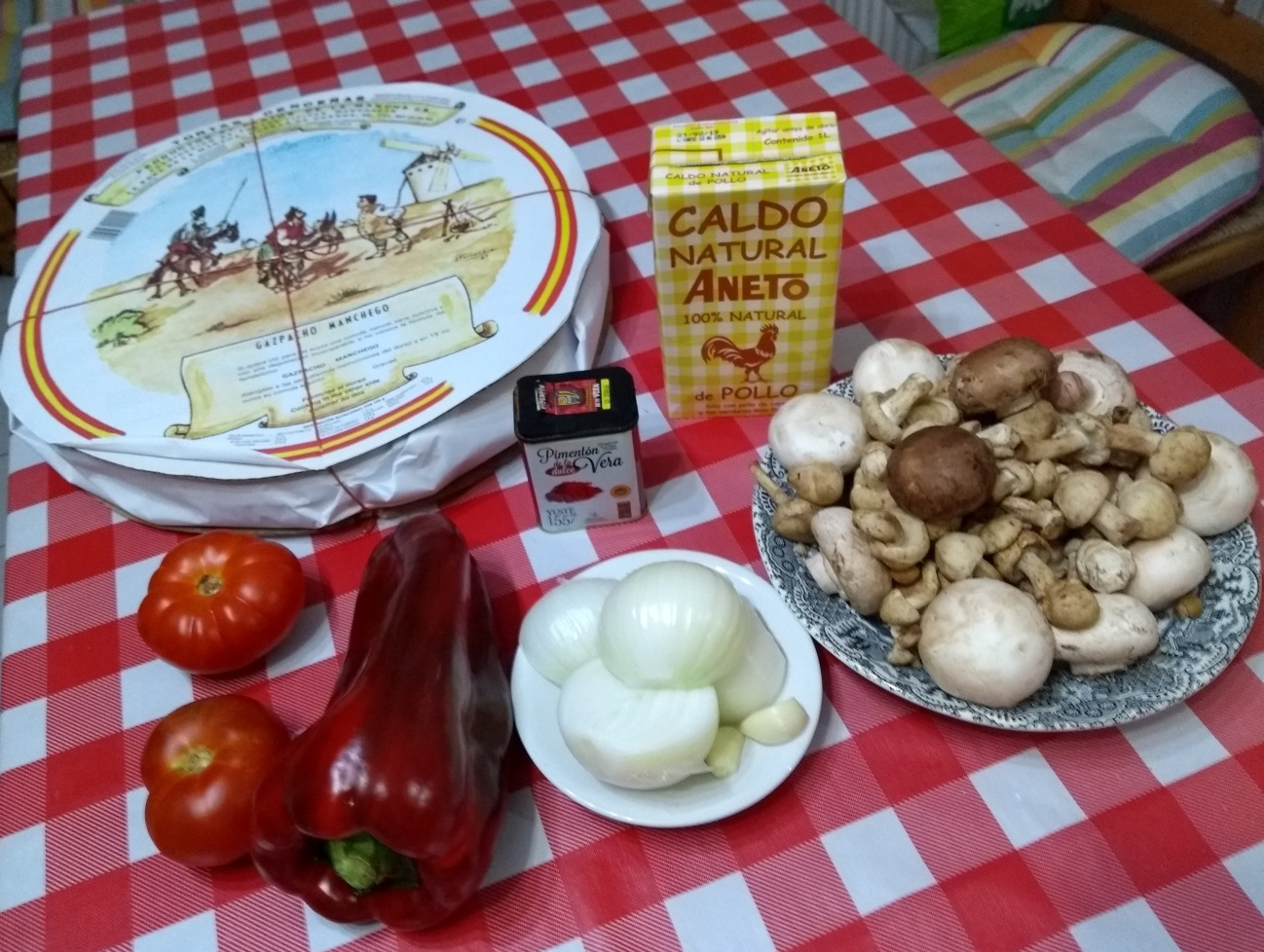 Este tipo de gazpacho nada tiene que ver con el Andaluz, es típico de la región manchega, de la que parte de mi familia proviene. En el Quijote se conocía a este guiso como Galianos, consiste en un guiso caldoso con torta cenceña manchega, que es pan ácimo, y era originalmente un plato humilde que hacían los pastores con lo que tenían a su alcance (carne de caza menor -liebre, conejo, perdiz, pollo-, setas, etc). Mi versión favorita de este plato es sin carne y con setas. Yo en esta ocasión he utilizado Portobello (Agaricus brunnescens), Perrechico (Calocybe gambosa) y champiñón (Agaricus bisporus), lo ideal sería utilizar silvestres y como una buena seta de cardo (Pleurotus eryngii), o caldo o fondo casero, pero hay que saber adaptarse a lo disponible y/o circunstancias J, esto también se aplica al tipo de pimiento utilizado, en mi opinión este plato sale mejor con pimiento rojo italiano, que es más dulce, pero la variedad de Lamuyo también sale muy bien. La torta cenceña yo la compro en www.ladespensadedulcinea.com, pero en España también se puede encontrar en diferentes supermercados. Este es un plato sencillo, suculento, que no tiene nada de grasa y se digiere muy bien, especialmente indicado para días de frío.