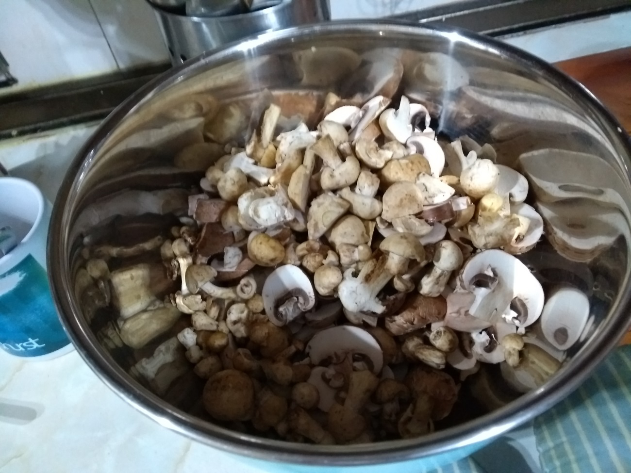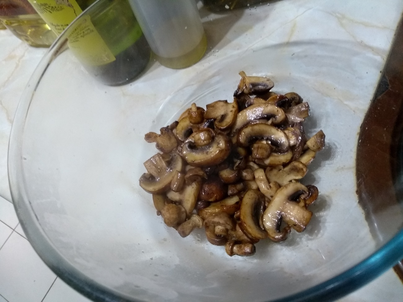 En una sartén (aunque yo he utilizado una olla alta), calentar, echar un chorrito de aceite y saltear las setas, cuando se haya consumido el líquido que sueltan, retirar.