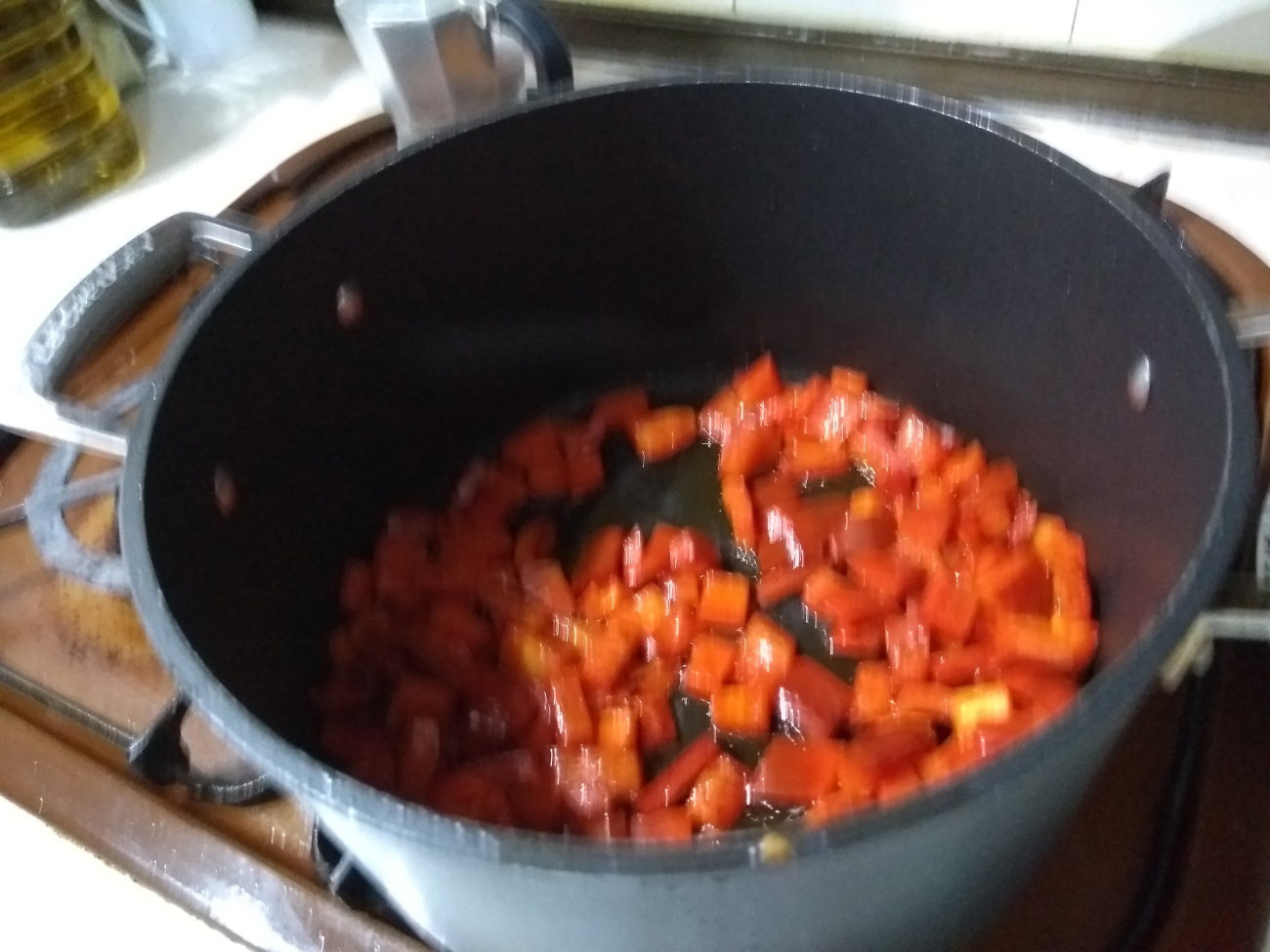 En esa misma sartén, si falta aceite, poner un poco más y sofreír ahora el pimiento a fuego medio-bajo se irán cocinando poco a poco al tiempo que soltarán su característico toque dulce y delicioso. Retirar.