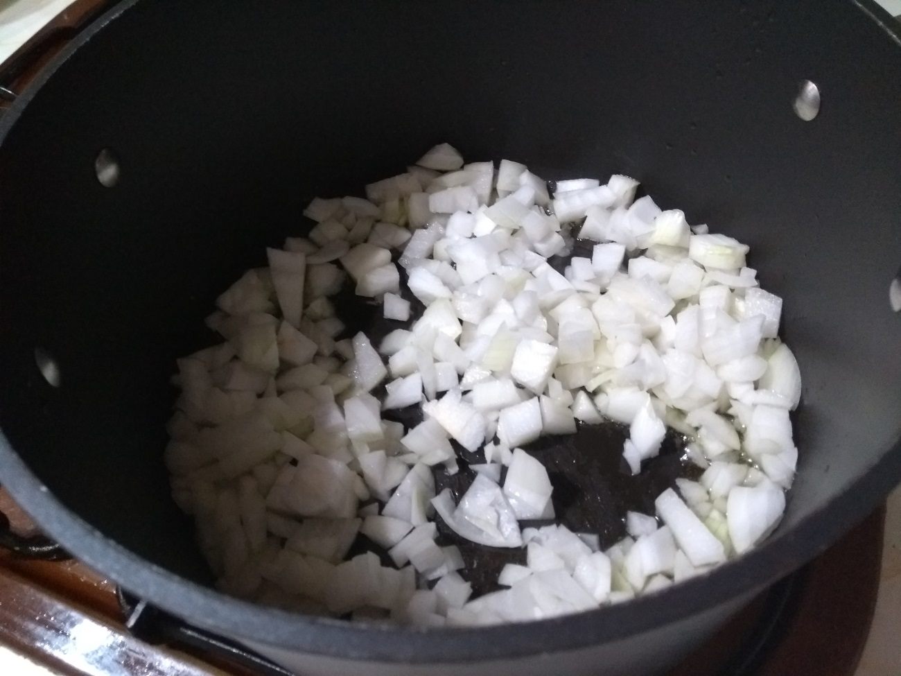 Ahora la cebolla a fuego lento, una vez dorada añadir los ajos, dejar estos que se hagan con la cebolla como 1 minuto.