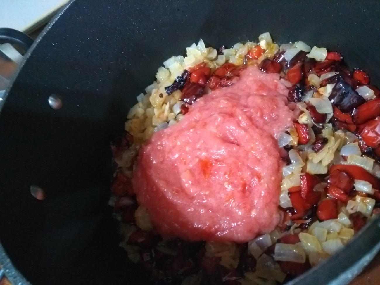 Incorporar el tomate triturado, cuando no suelte más agua, añadimos el pimentón y removemos rápidamente con cuidado de que no se queme, sino daría un sabor muy amargo y a continuación añadimos el vaso de vino.