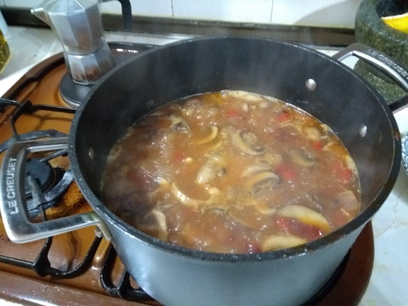 Ahora llevar a ebullición el caldo de pollo, añadir el sofrito y las setas y pimientos.