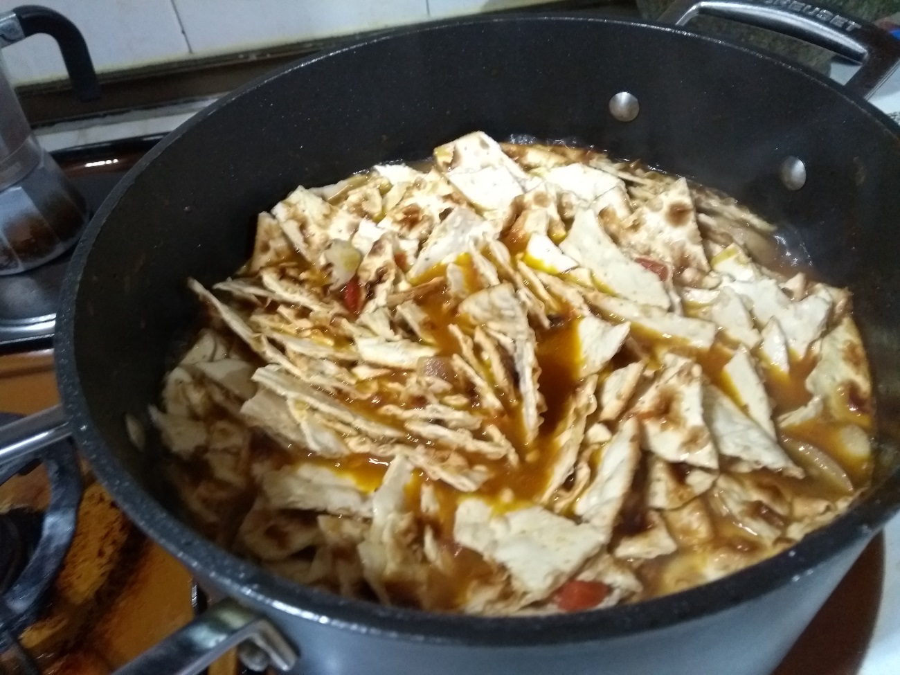 Poco antes de comer es cuando se incorpora la torta de cenceña al guiso, partida en trozos, se baja el fuego y de vez en cuando remover suavemente durante unos 14 ó 15 mínutos, la torta debe quedar un poco al dente.